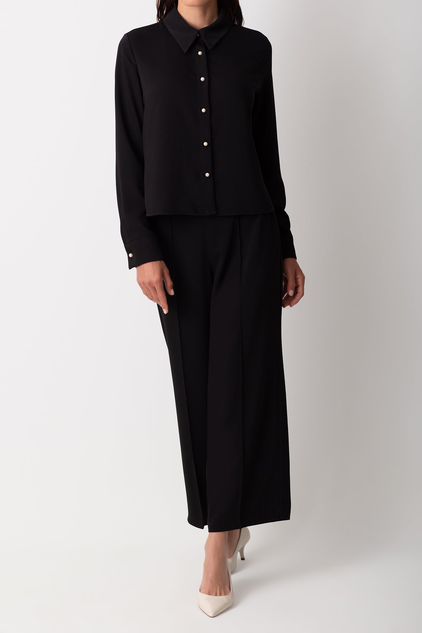 MEVSİMLİK İNCİ DÜĞMELİ UZUN KOLLU SİYAH GÖMLEK