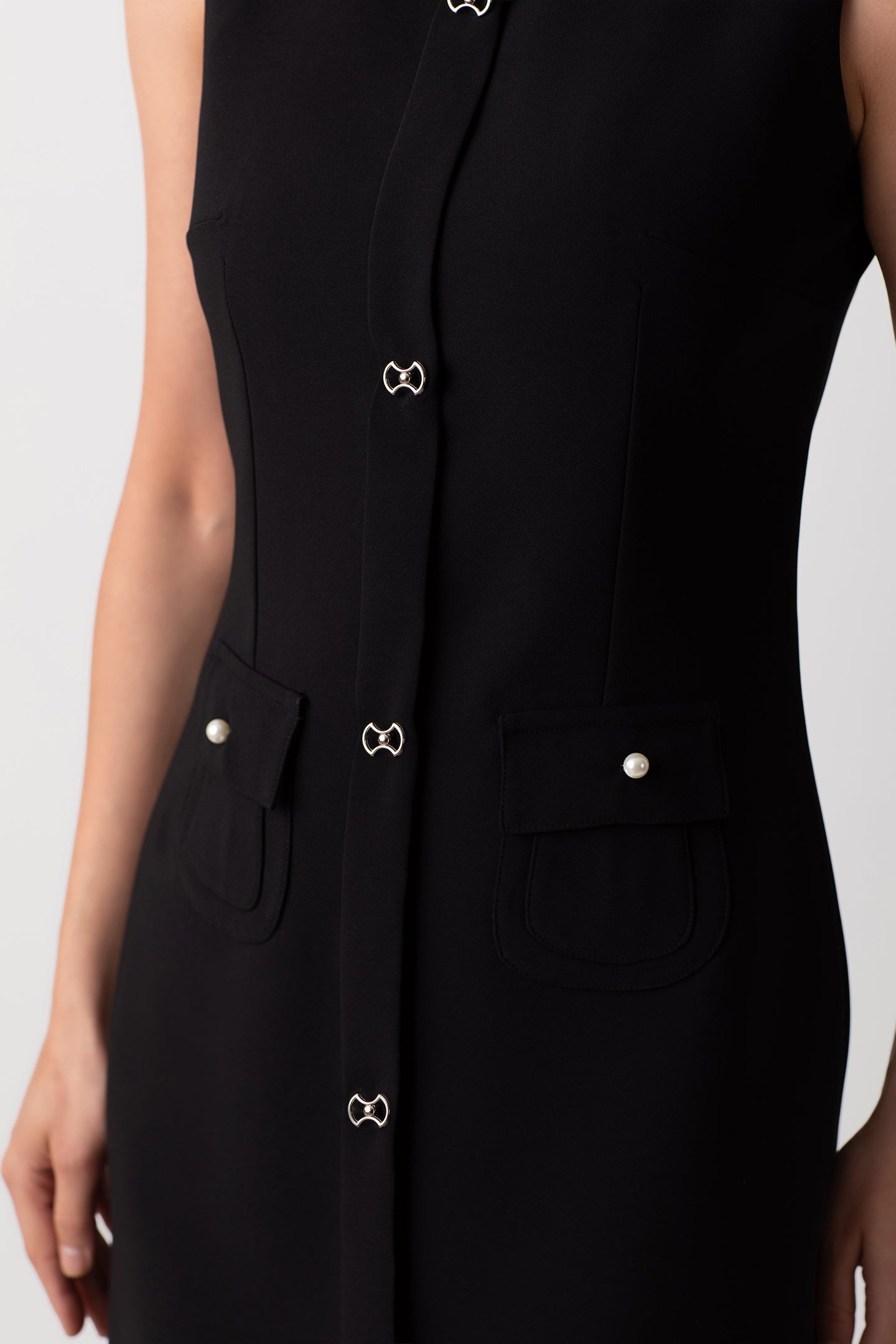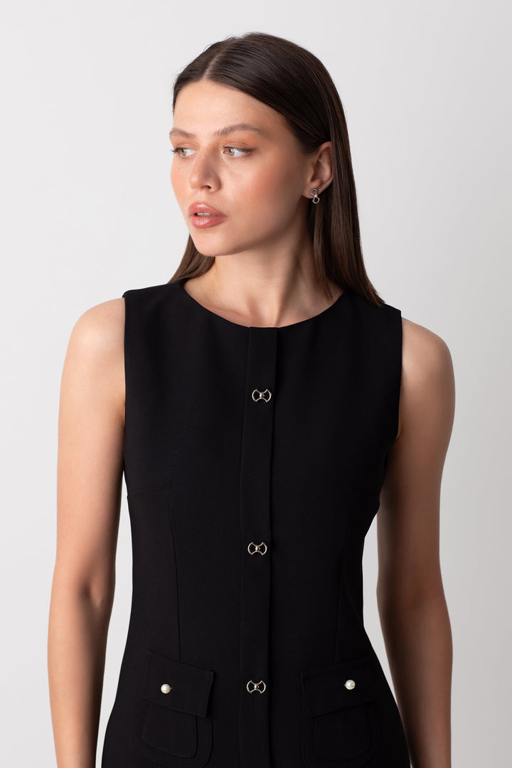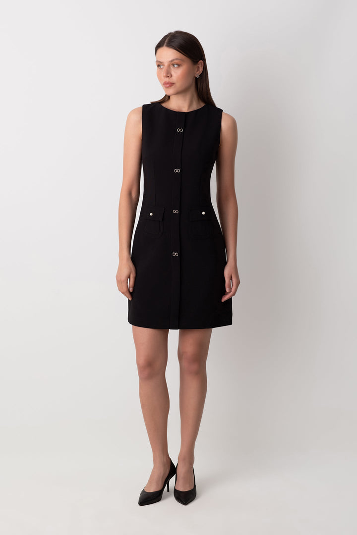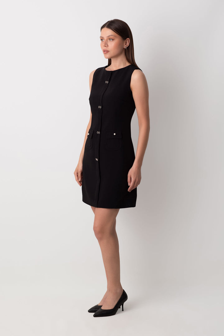 VENUS DÜĞMELİ İNCİ CEP DETAYLI KISA SİYAH ELBİSE