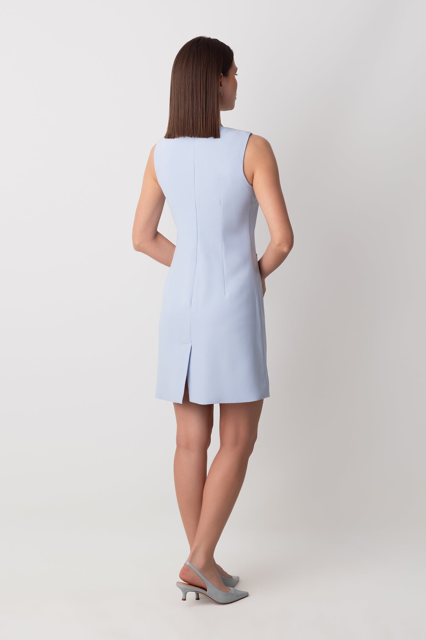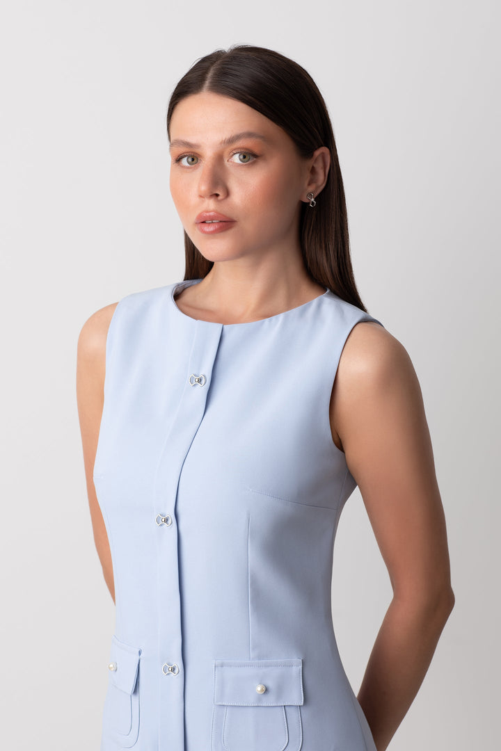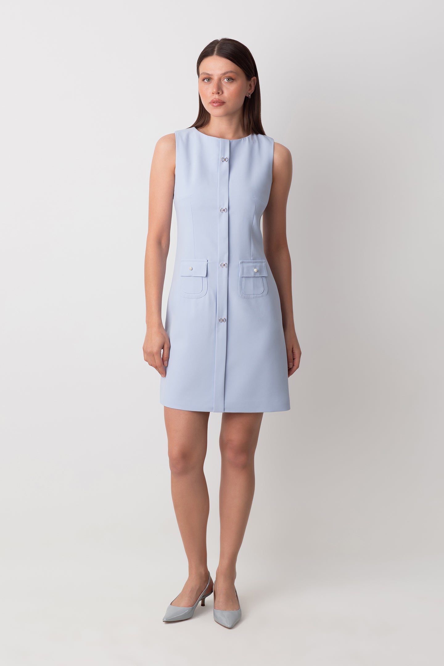 VENUS DÜĞMELİ İNCİ CEP DETAYLI KISA MAVİ ELBİSE