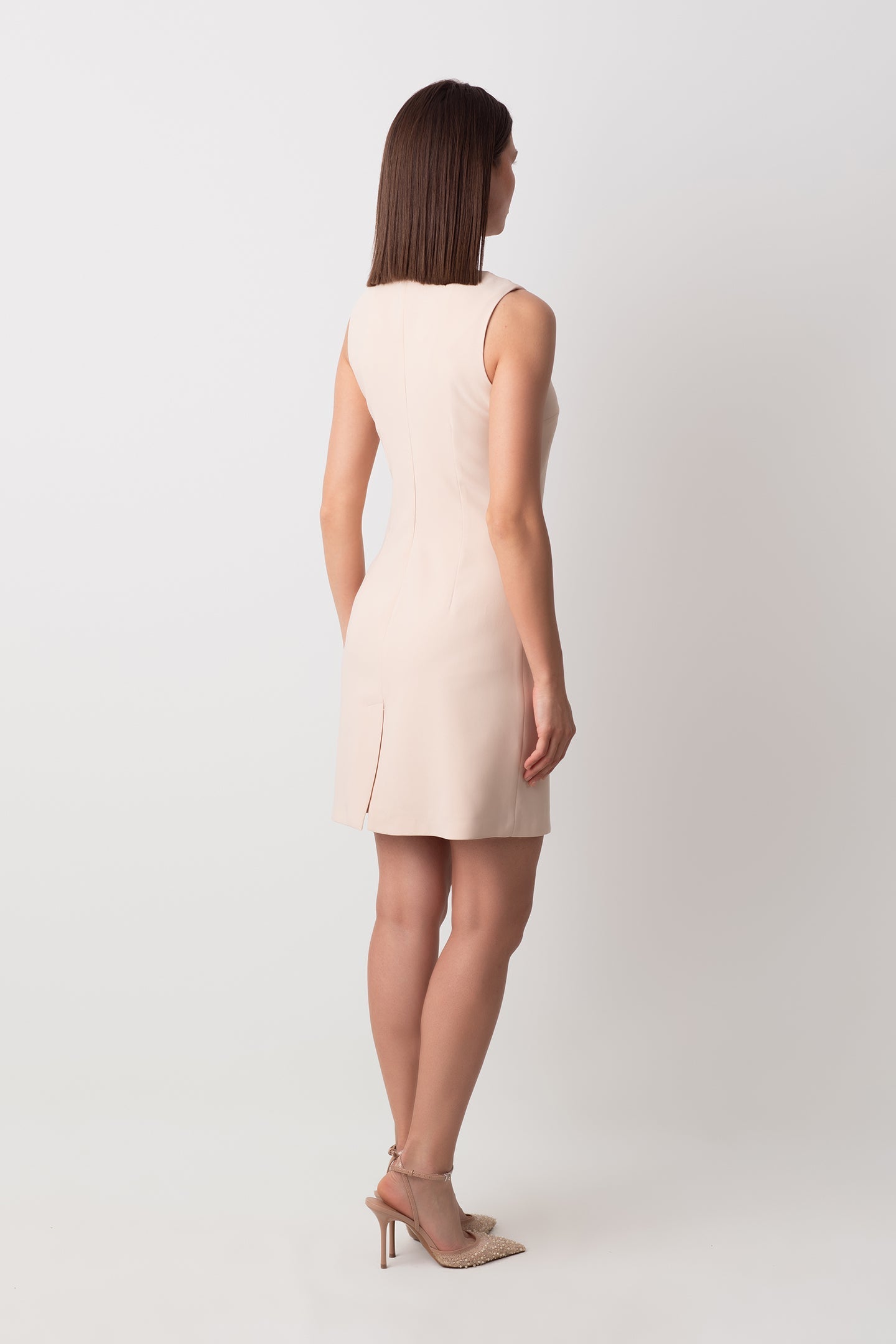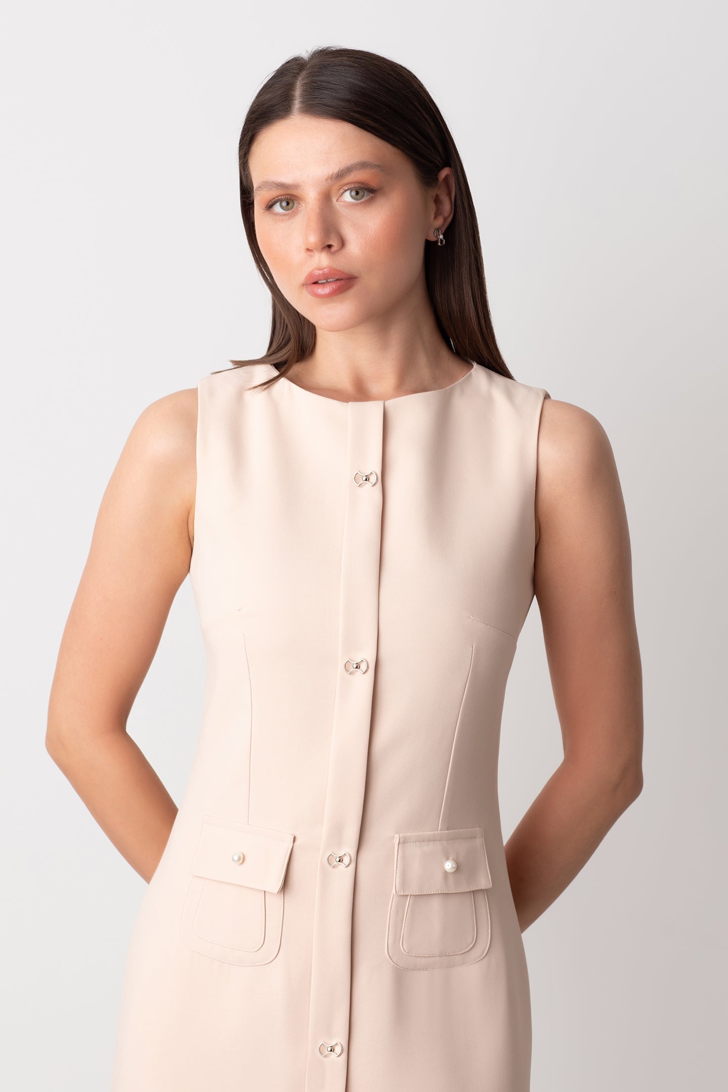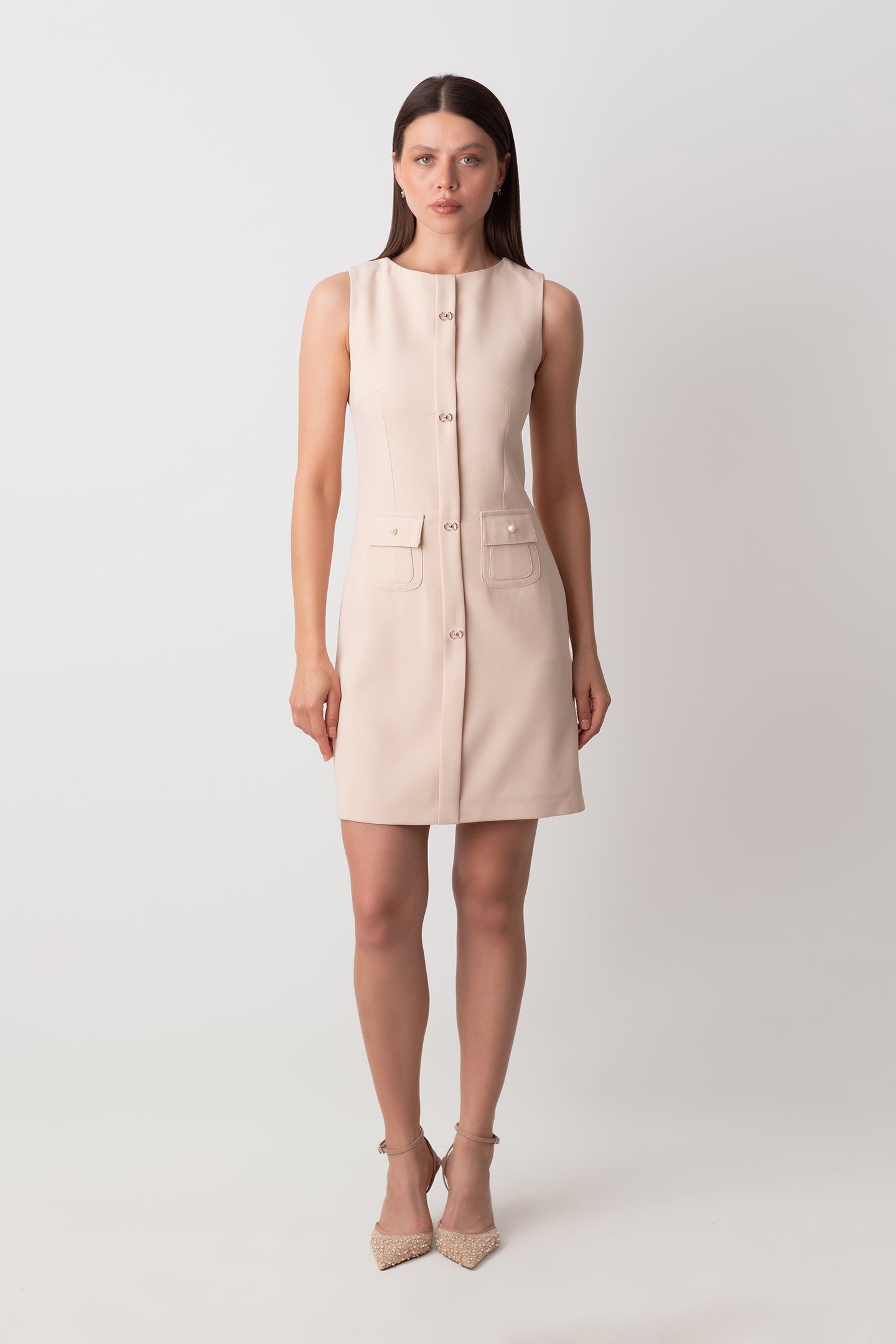 VENUS DÜĞMELİ İNCİ CEP DETAYLI KISA KREM ELBİSE