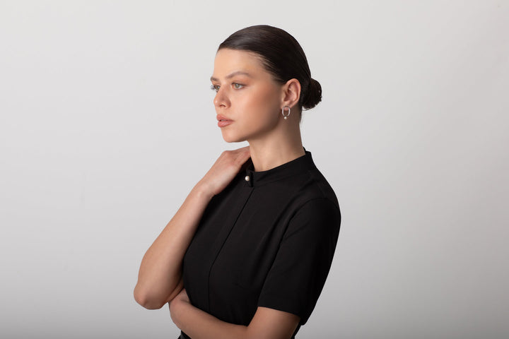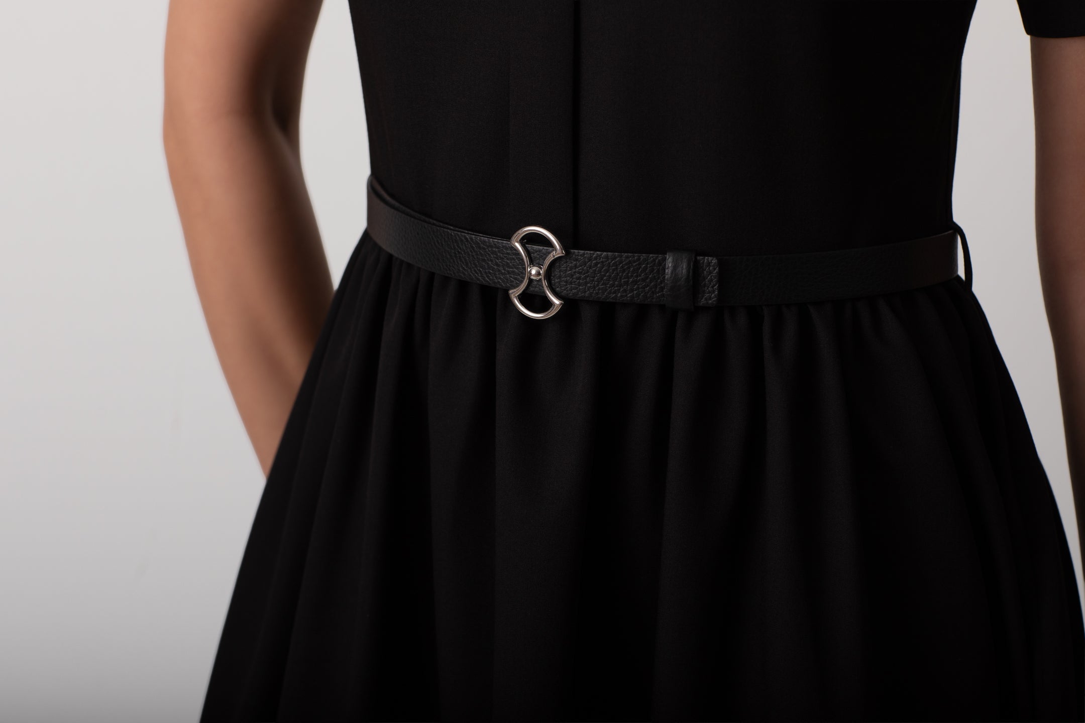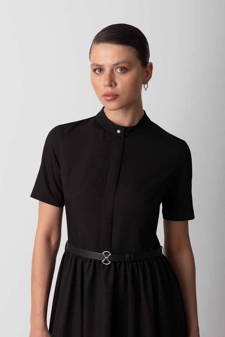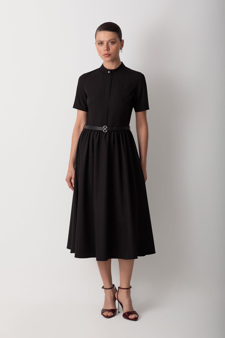 BELİ BÜZGÜLÜ MİDİ SİYAH ELBİSE